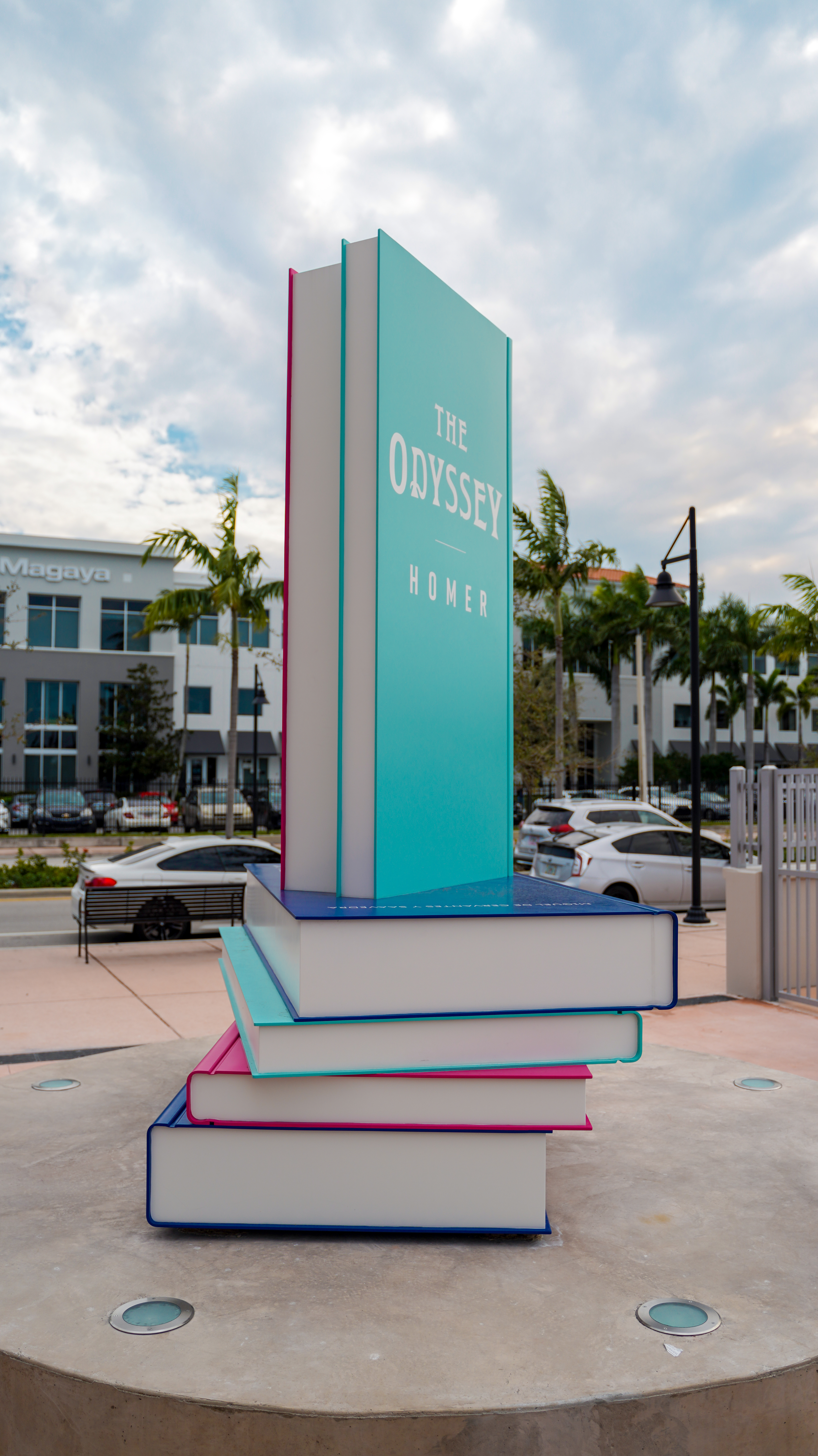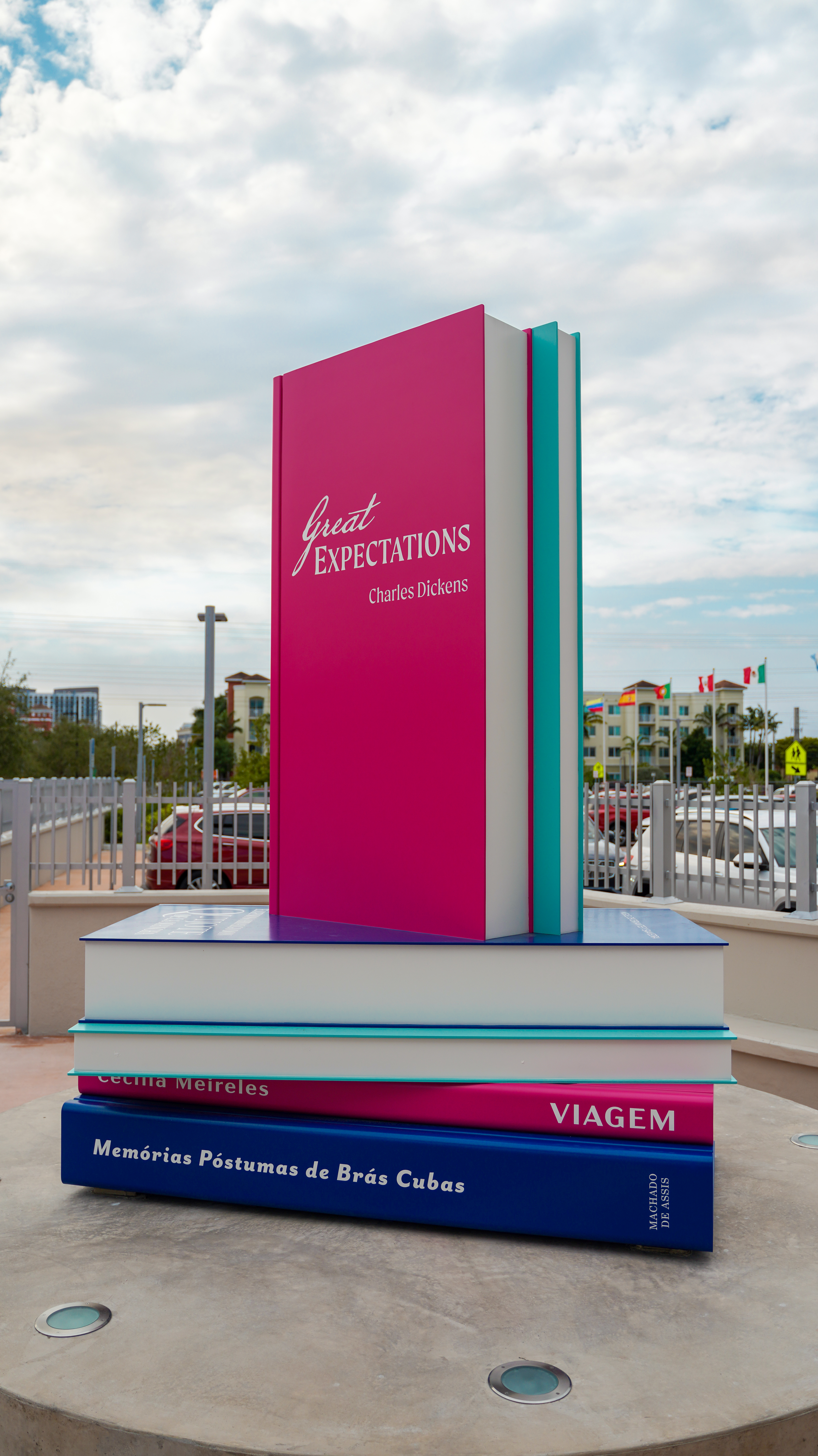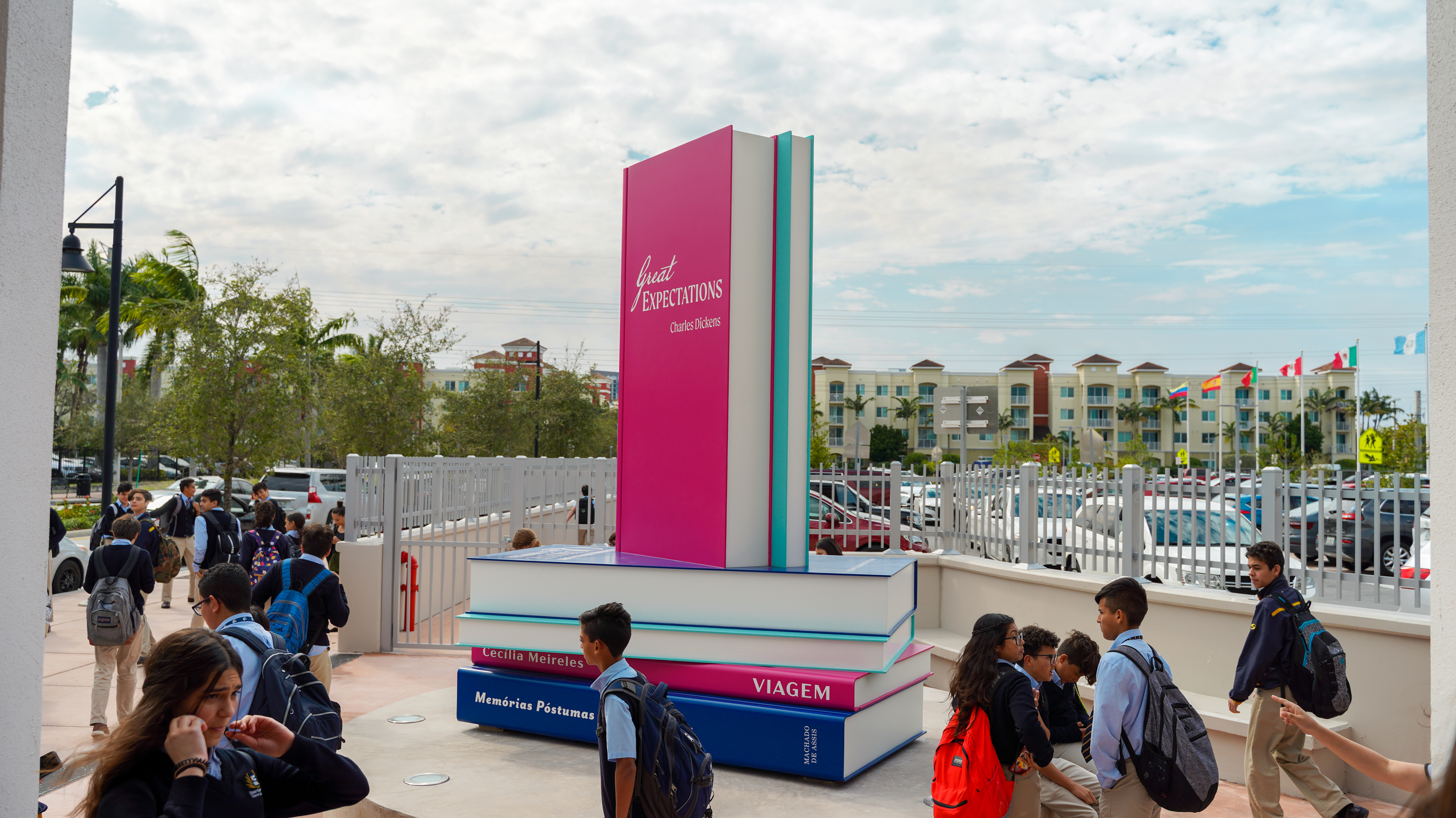Goldman Global Arts, in partnership with UAP Studio, created a 12-foot tall sculpture of books that adorns the main entrance of Downtown Doral Charter Upper School (DDCUS).