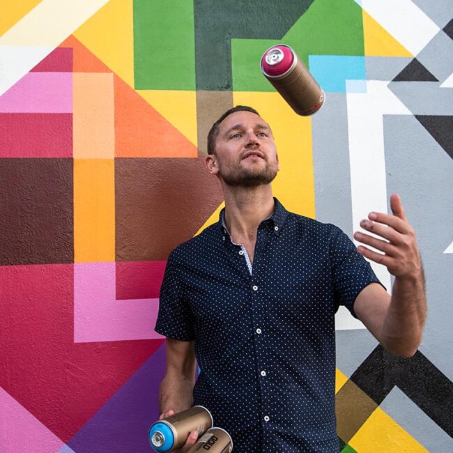Tavar Zawacki (born 1981) is an American abstract artist based in Berlin, Germany. For twenty years (1996–2016) Tavar Zawacki created and signed all of his artworks with his street artist pseudonym, ‘ABOVE’. At the age of 19, Tavar bought a one-way flight from California to Paris, France, bringing with him a backpack full of art supplies, all the money in his bank account, and a ‘rise above your fears’ approach to starting his art career. Starting in Paris in 2000, Tavar transitioned from painting traditional letter style graffiti of A-B-O-V-E, to his ‘Above arrow’ icon that represented his optimistic mentality to ‘rise above fears, challenges, and anything holding you back from your goals. During a 20-year period the artworks of ABOVE could be seen in over 100 cities spanning 50 countries around the world. In January 2017, Tavar Zawacki decided to step out of his self-imposed shadow of anonymity, and start creating, and signing artworks with his real birth name – allowing more freedom of creative exploration, as well as liberation from the arrow icon he has associated himself with. Tavar Zawacki’s painting styles with his large-scale mural works, as well as his indoor fine art are characterized by the use of hard-edge painting, color field, geometric abstraction, Op art, and Trompe-l’oeil painting styles. Tavar Zawacki has been showcasing his work in galleries and creative institutions around the world since 2005.