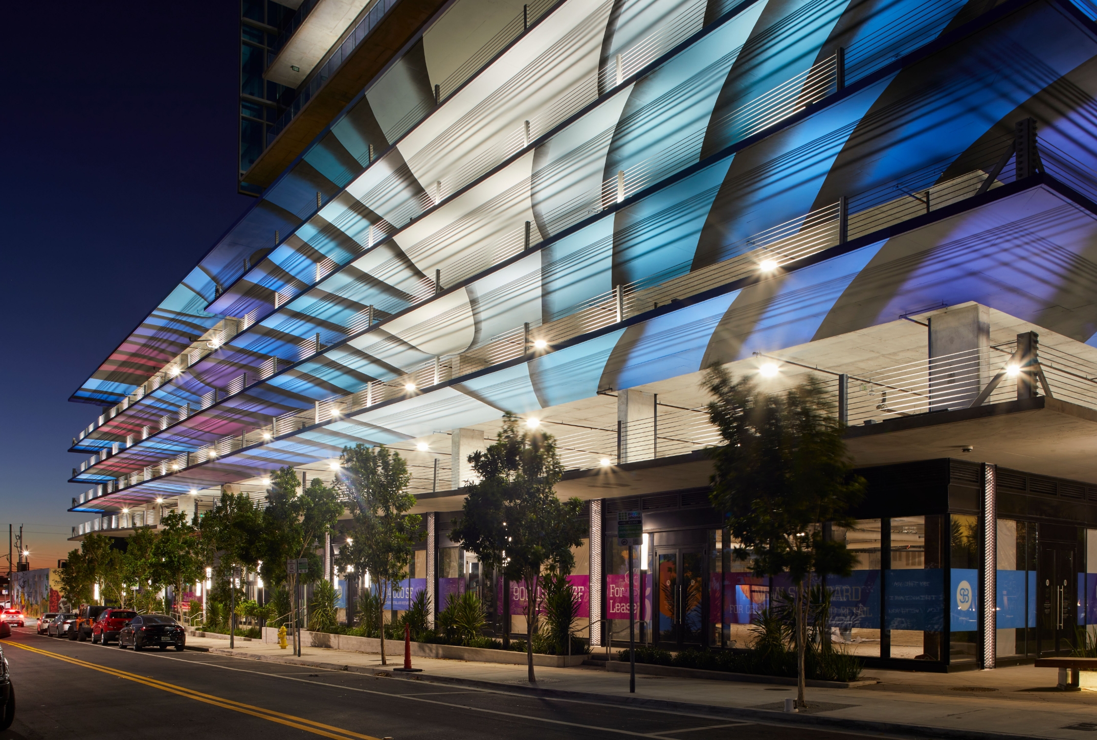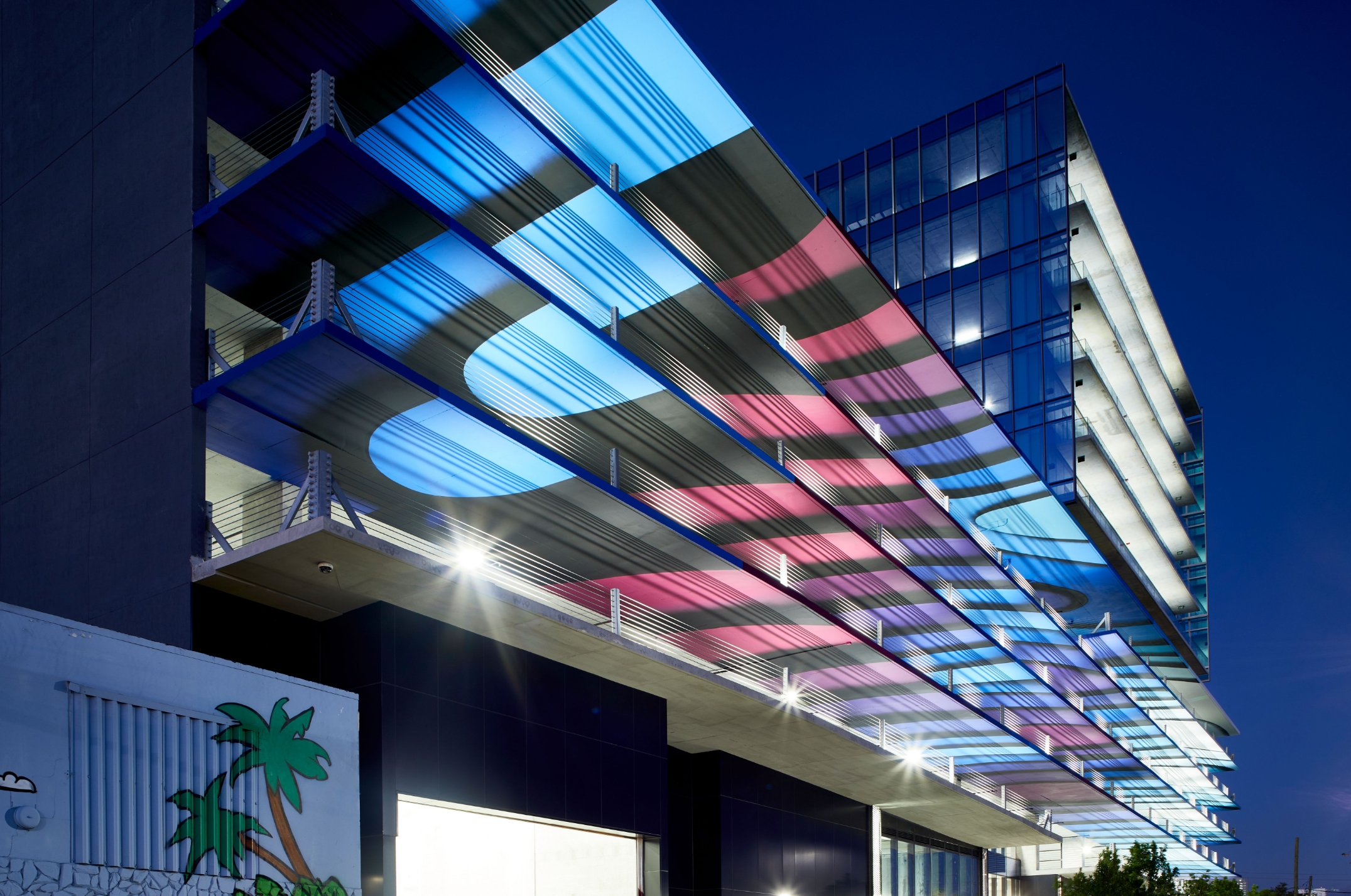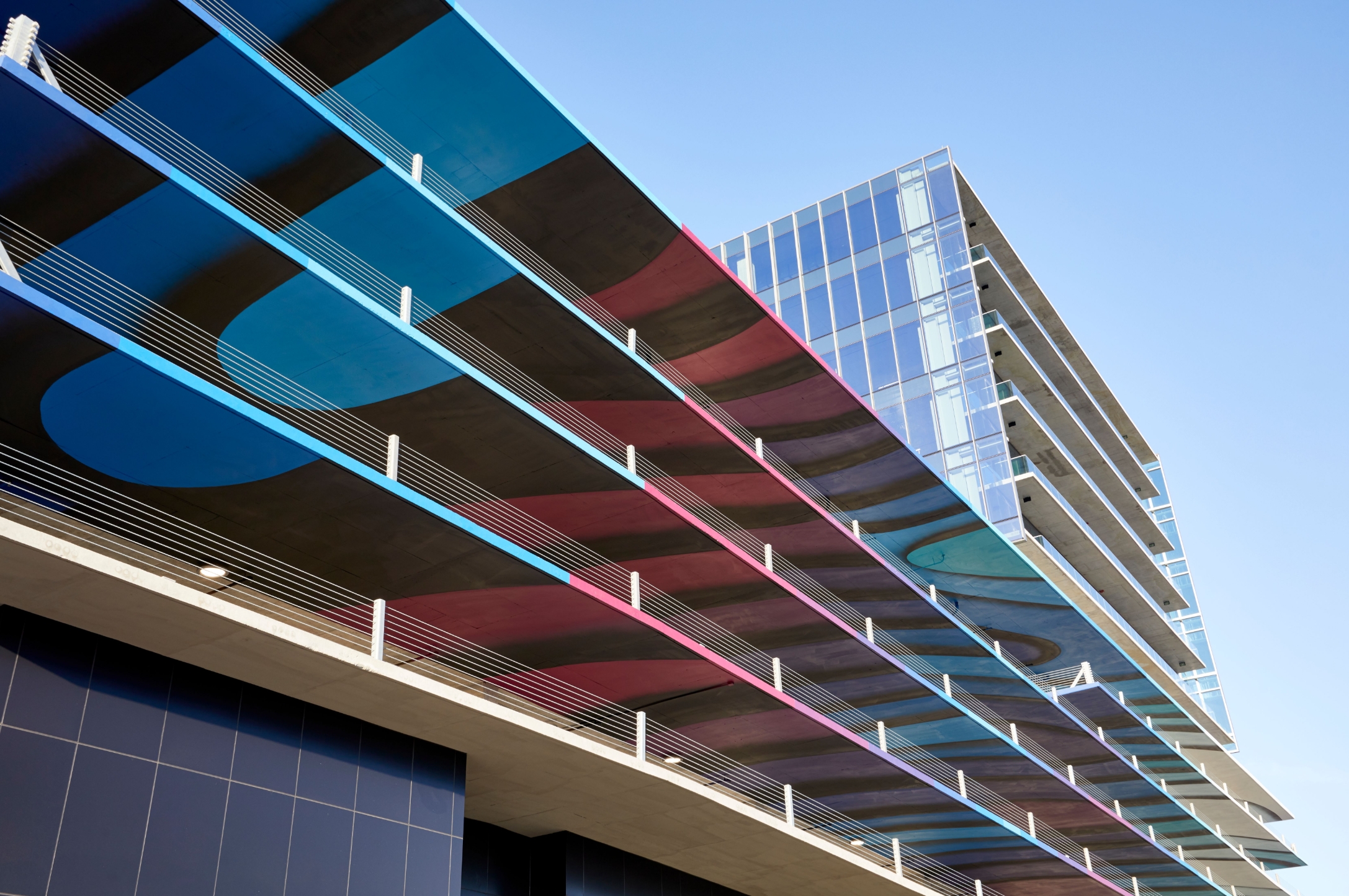 For the two roll-up doors of the 325,000 square foot building, local professional visual artist MOJO, known for crafting inspiring visual narratives. For the ceiling of the 420-car garage, Goldman selected German street artist 1010, known for his use of concentric layers of color.