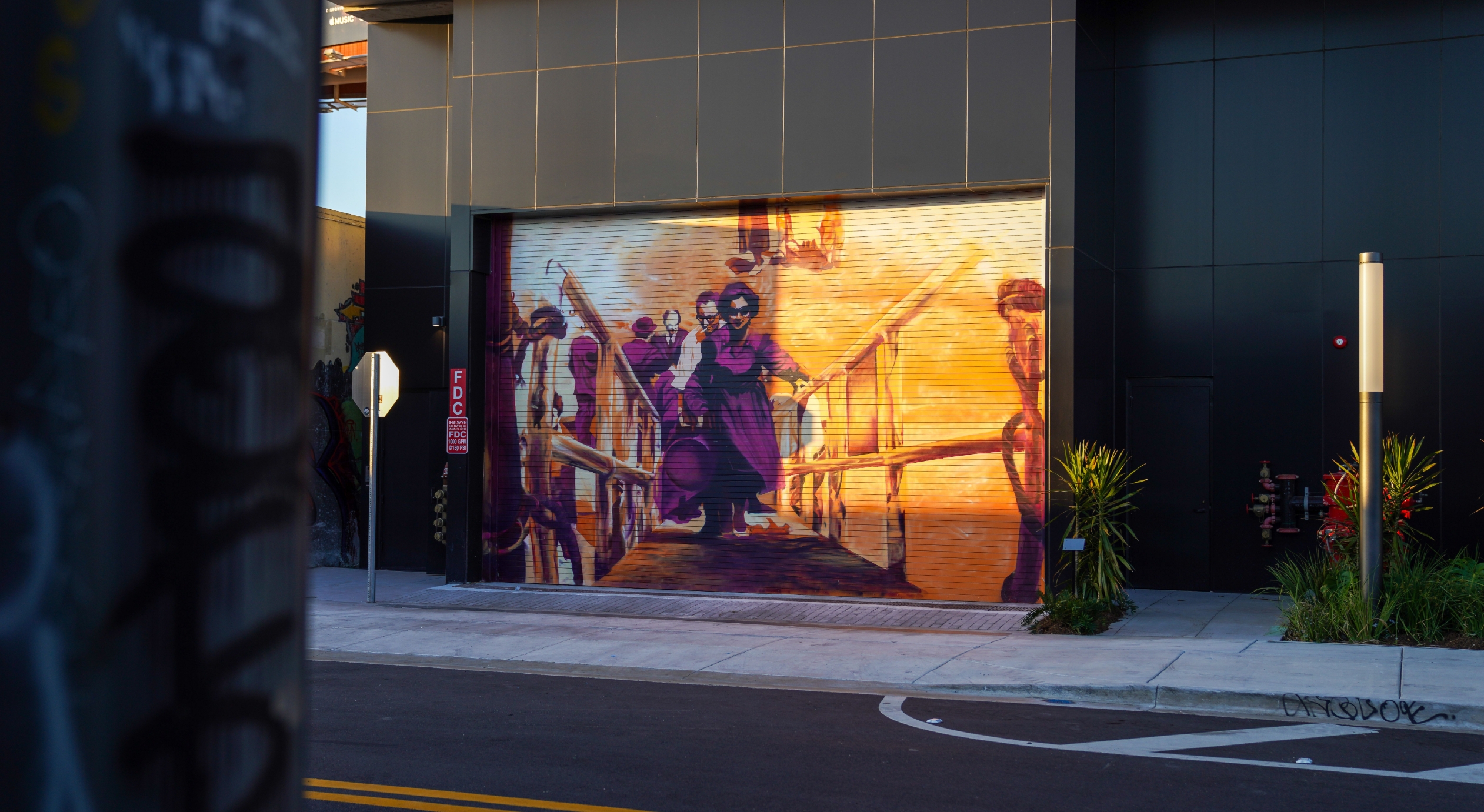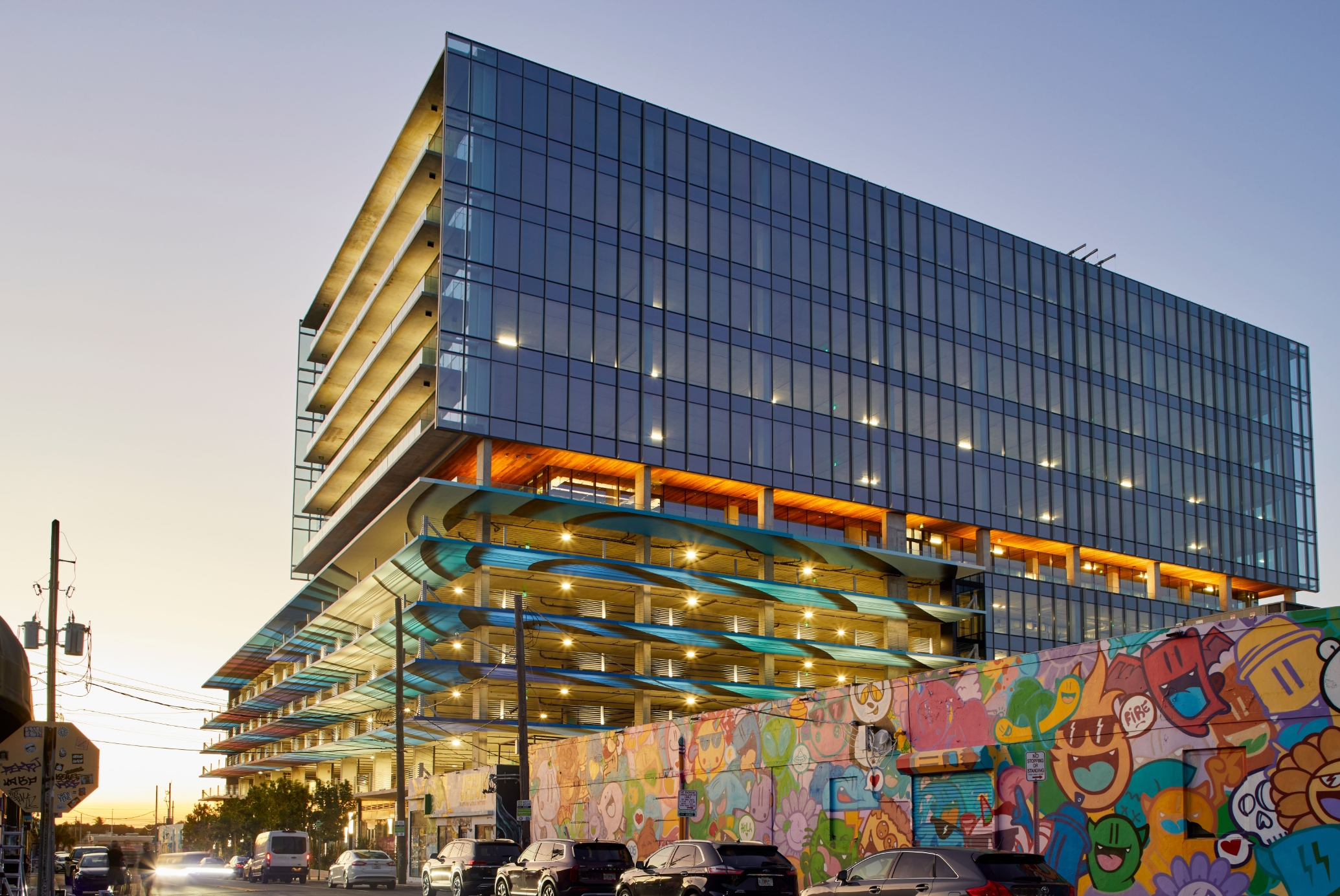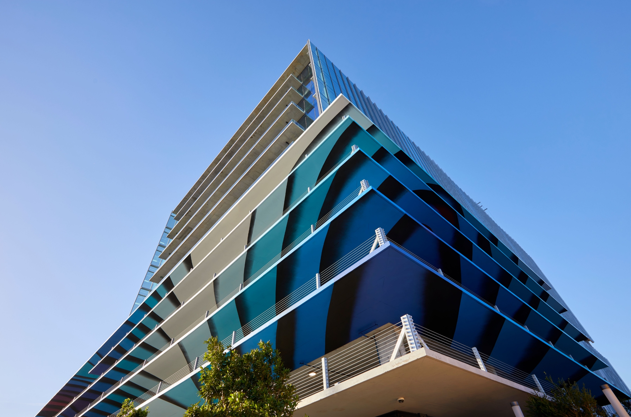 For the two roll-up doors of the 325,000 square foot building, local professional visual artist MOJO, known for crafting inspiring visual narratives. For the ceiling of the 420-car garage, Goldman selected German street artist 1010, known for his use of concentric layers of color.